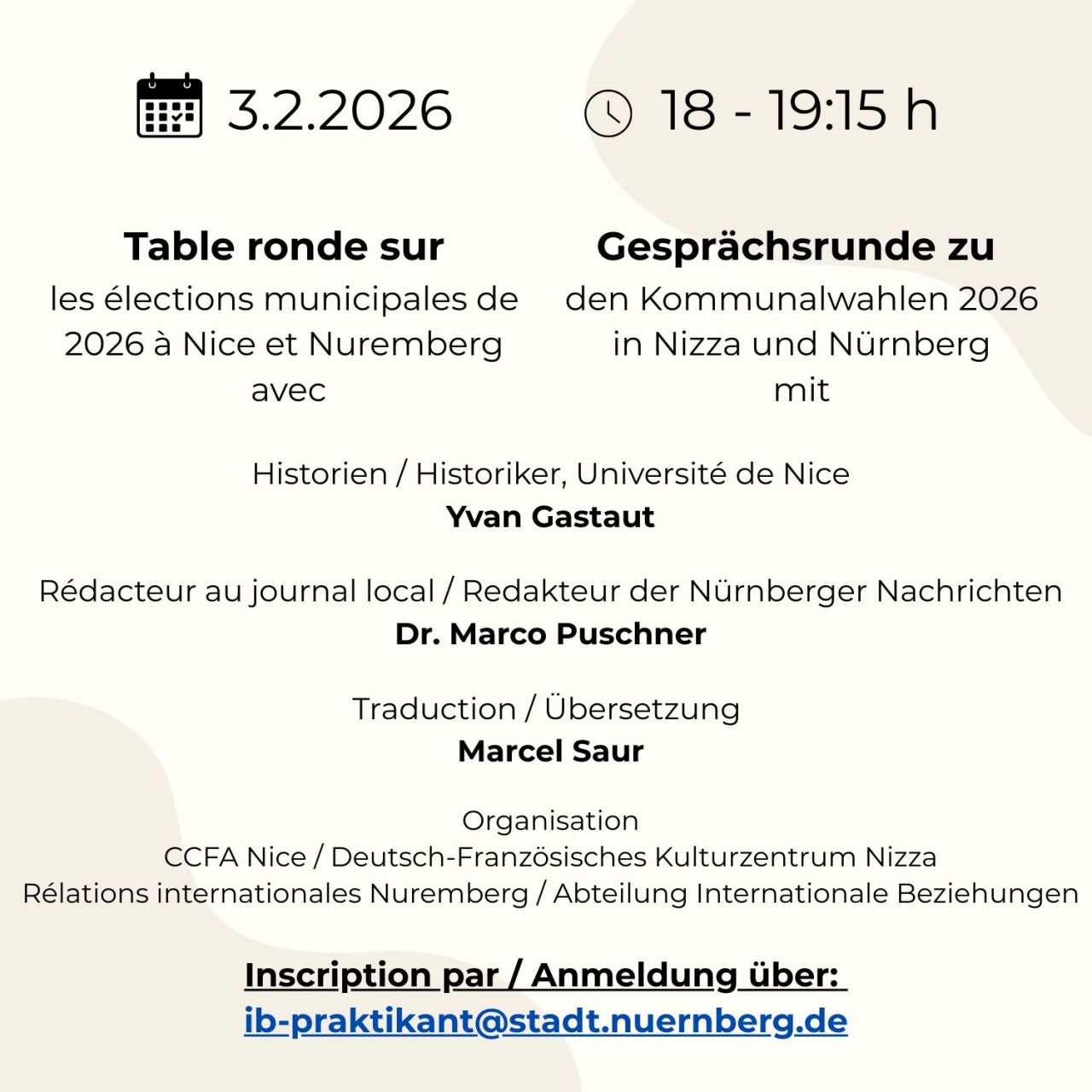 Si vous souhaitez participer à cet événement, veuillez vous inscrire avant le 2 février 2026 à l’adresse suivante : ib-praktikant@stadt.nuernberg.de. Un lien vous sera envoyé peu avant la date de l’événement.